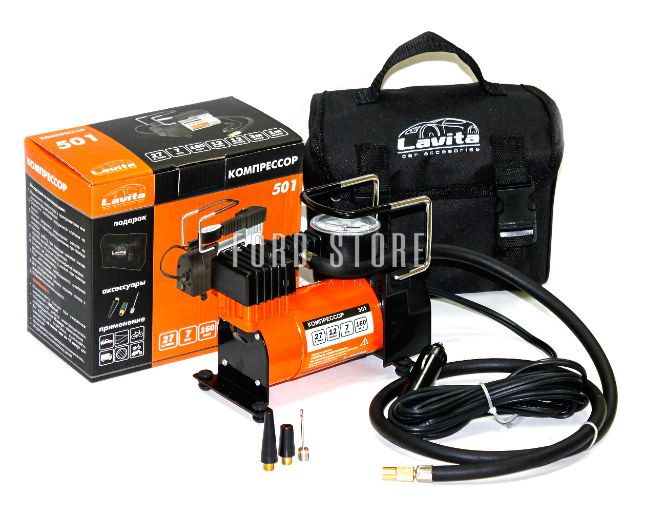 За Вашим запитом запчастини: 191501/LAVITA, ми знайшли наступний товар: Компресор для підкачування шин 12В, 12А, 10 АТМ, 27 л/хв..